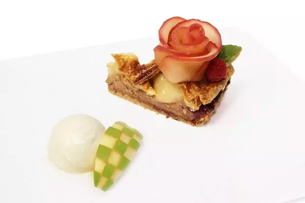 「アップルパイ」には、酸味と風味が良く、焼き菓子に最適なグラニースミスを使用。シナモンを効かせたカスタードをベースに、ごろっとしたりんごをパイで包み、ローズに見立てたりんごを飾った。