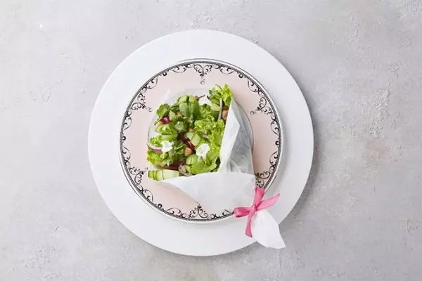 メニューは、前菜からメイン、スウィーツ、ドリンクまで揃う。グリーンやピンク、イエローの鮮やかな色で溢れる料理は、見た目が美しいだけでなく、美容によいといわれる食材を使用した。「ビューティ ブーケ サラダ」は、まるで花束のブーケのような可愛らしい見た目。抗酸化効果が高いケールやビーツ、サーモンが使用されている。