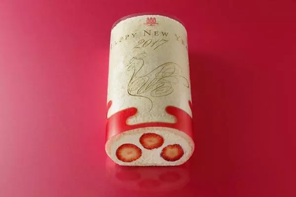 お正月らしい紅白のロールケーキ「新春いちごロール」は、目にも鮮やかな真っ赤ないちごと口当たりのよい生クリームを、ふんわりやわらかな白いスポンジ生地で包み込みんだスイーツ。ロールケーキの周りには2017年の干支である酉を金色で描いたフィルムを巻いた、縁起の良い逸品だ。