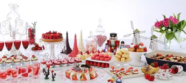 2015年の開催時は、3ヶ月強の開催期間中に約2.5トンの苺を使用し、連日満席という人気を博したストロベリーブッフェ。人気のブッフェで夢のあるスイーツを手掛ける総料理長アリスター・カーターが今回目指したのは、世界を旅する気分を味わえる苺デザートだ。ブッフェ台には様々な国の風景を再現し、世界各地をイメージした20種以上のメニューが提供される。