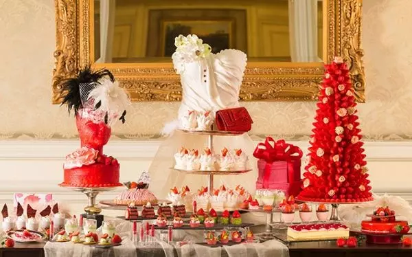 砂糖菓子で作られたドレス型のアフタヌーンティースタンドに並ぶ小さなケーキ「ストロベリーミニパボロバ」や、ベルベット生地のソファを思わせる「ストロベリーとマンゴーのチーズケーキ」、リップ型のチョコレートが乗った「ストロベリーマカロンタルト リップチョコレート」など、ファッショナブルなデザートに心踊ること間違いなしだ。