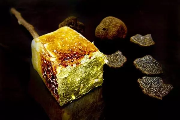 フォアグラやキャビアと並んで、世界三大珍味として知られる黒トリュフを使用。甘さとほろ苦さが絶妙なキャラメルアイスの中に香り豊かな黒トリュフをたっぷりと詰め込んだ。