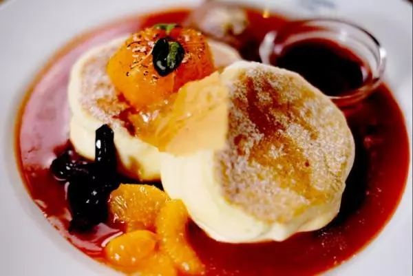 味に変化を付けたくなった時は、別添えのオレンジキュラソーをかけて染み込みませることで、パンケーキはぐっと大人の表情に。「スフレパンケーキ」と「スプーンで食べるパンケーキ」では、オレンジキュラソーをかけた時の表情はまるで別の顔で、それぞれ異なる味わいが楽しめるとのこと。