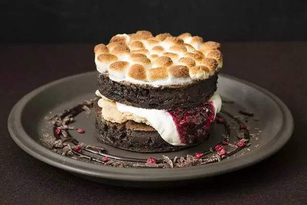 ブラックココアを練り込んだビターな生地をベースにした「ブラックスモアパンケーキ」は、オーブンで焼き上げたマシュマロと、生地の中のラズベリーガナッシュが、ナイフを入れた瞬間にとろけ出す一皿。グラハムビスケットやホイップクリーム、アクセントとして忍ばせた4種のベリーソースと合わせて召し上がれ。