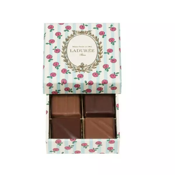 中国とセイロンの紅茶に、バラの花茶と柑橘類をブレンドした「テ・メランジェ・スペシャル・ラデュレ」の香りのガナッシュをミルクチョコでコーティングしたショコラは、バニラの甘い香りの中に、ほのかなシナモンが漂う。また、中国の緑茶にミント・ジンジャー・オレンジの花・バラをブレンドした「テ・ミル・エ・ユヌ・ニュイ」の香りのガナッシュをミルクチョコレートでコーディングしたショコラは、優雅でオリエンタルな風味に仕上がっている。