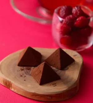 ゆっくりとなめらかに溶ける口どけチョコ「ロイヤルモンターニュ」は、ダージリンティーの香りとチョコレートのコクが口いっぱいに広がる一品。“王家の山”という名前の由来になっているピラミッドの形は、理想の口どけを考えてたどりついた形状だ。