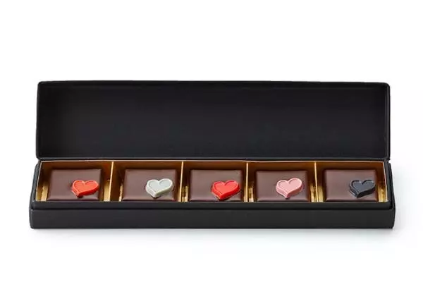 バレンタイン限定ショコラの一つ「ラグジュアリーボンボン」は、ジョンカナヤが得意とするお酒の融合を生かしたアソート。オレンジリキュールの名酒「グランマルニエ」や、複雑なアロマのポートワイン「テイラー」、スモーキーフレーバーが香るウイスキー「アードベッグ」など、5種類のお酒が使用された大人のためのショコラだ。