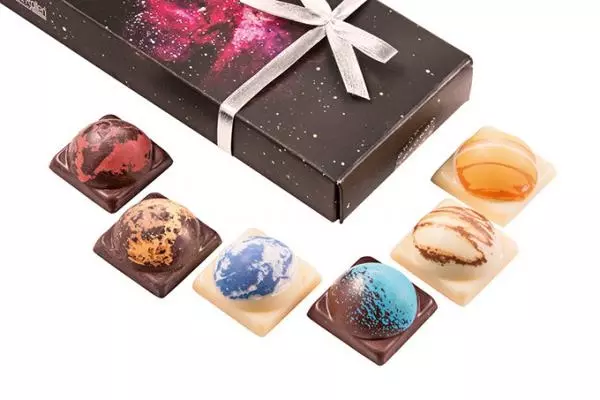 友チョコにオススメしたいのは、「銀河惑星」をチョコレートで表現したアストロノミーの「ギャラクシショコラ」。地球はラズベリー、火星はピーチなど、見た目だけではなく、惑星ごとに異なる味を楽しめる。