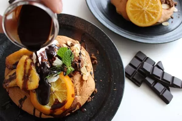 ランチタイム限定の「オレンジショコラパンケーキ」はジューシーなオレンジとキャラメリゼした完熟バナナ、ココアクランブルの3種類をトッピングしたパンケーキに、温かい濃厚チョコレートソースをかけて味わう一品だ。生地にもとことんこだわり、メレンゲを使用した生地は、しっとりかつふわっふわの焼き上がりに。