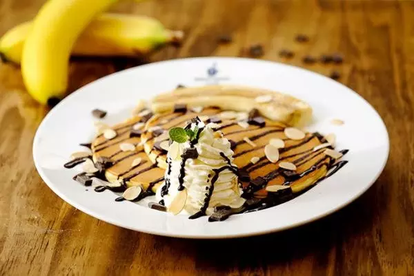 ファンの中で人気を集めていた「チョコバナナパンケーキ」は、キャラメリゼしたバナナとチョコレート、アーモンドを合わせた一皿。ふんわり焼き上げたパンケーキに、チョコレートソースとアーモンドをあしらい、キャラメリゼしたバナナ、ホイップクリームを添えた。