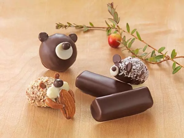 スイートチョコレートのプレーンガナッシュで仕上げたクマには、サクサクしたスイートチョコレートの鼻をあしらって。一方ハリネズミは、ココナッツ風味のガナッシュをスイートチョコレートでコーティングし、上からココナッツをトッピングしてハリネズミのとげを再現した。