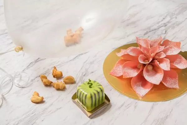 「空飛ぶケーキ」は、フワリ宙に浮かぶバルーンの中にケーキを詰め込んだもの。パンッと割ってから食べる斬新さで、つい笑顔になってしまうスイーツだ。そして、淡いピンクに色づいた花が可憐に咲き誇る「フラワークッキー」も。香り豊かなローズクッキーと爽やかなライチガナッシュが絶妙なバランスを織り成す。