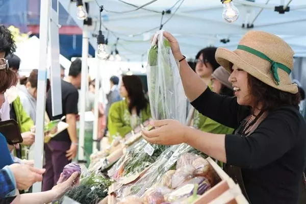 「博多ファーマーズマーケット」は、自然豊かな九州で採れた農作物を楽しめる屋外市場。九州の約40の生産者や加工業者などが自ら赴き、選りすぐりの農産物や加工品を直接販売する他、人気シェフが会場で地元の食材を調理してくれる。