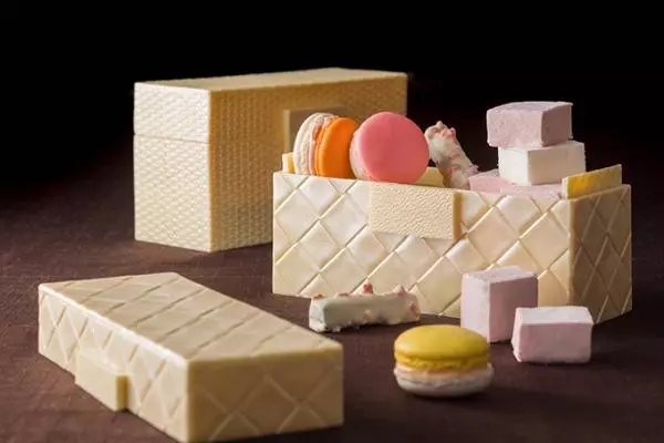 「ビジュー」はホワイトチョコレートで作られたジュエリーボックスの中に、 マカロン・苺フロマージュ味のマシュマロ・チョコレートを宝石に見立てて飾りいれた、美しい一品。パールのように輝くボックスは、チョコレートの表面を丁寧に磨き上げることで柔らかなクッションの質感を細部まで再現した。