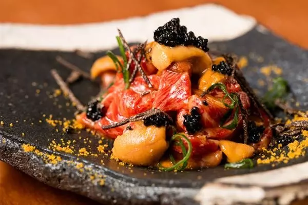 中でも是非食しておきたい名物は、希少部位の三角バラを生食にして、キャビア、トリュフ、雲丹を加えた贅沢なユッケ「世界一美味しいKINTANユッケ」。厳選した食材を贅沢に使い、“世界で1番美味しいユッケ”を目指したという自慢の一品だ。