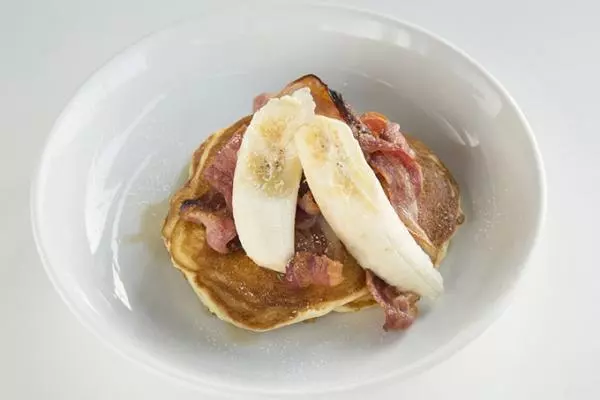 「バターミルクパンケーキ w/スモークベーコン、パイナップル、メープルシロップ」