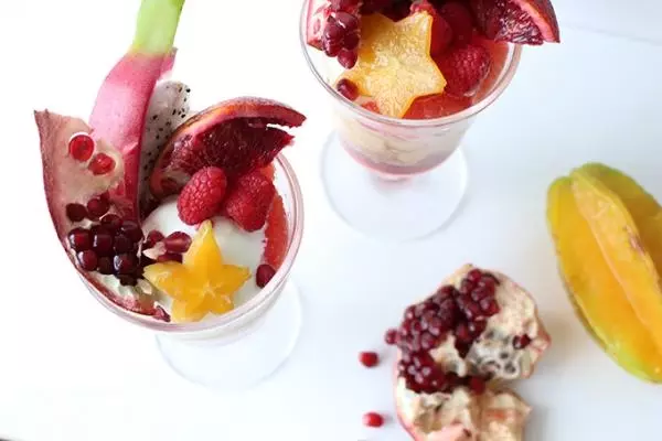 新作パフェにはドラゴンフルーツやざくろなど、なかなか普段味わう機会の少ない贅沢な果物をぎゅっと詰め込んだ。見た目も華やかな一品で、一足早く南国気分を味わって。