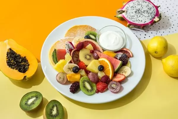 「18種類のフルーツパンケーキ」はドラゴンフルーツ・スイカ・いちご・パイナップル・ぶどう・キウイ・ブラッドオレンジ・マンゴーなど、18種類ものフルーツをトッピングした一品。豊富なビタミンや食物繊維が、体に栄養を与えてくれる。