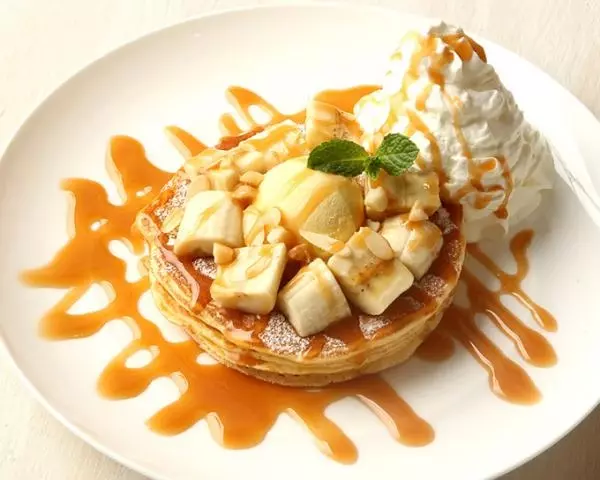 「キャラメルバナナパンケーキ」は、滑らかでとろけるような口どけとふわふわ食感のパンケーキに、バナナをたっぷりとのせ、トッピングに香ばしいマカダミアナッツとアーモンドスライスを散りばめた一品。仕上げに濃厚なキャラメルソースをかけた。