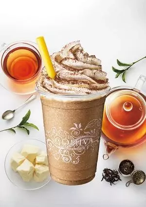 冷たいドリンクの中には小さく砕いたホワイトチョコレートを加えて食感にもサプライズをプラス。さらに、ホイップクリームの上には、インド産ダージリン紅茶葉100%のパウダーがトッピングされており、上質な茶葉特有の“マスカテルフレーバー”で優雅な香りも楽しめる。
