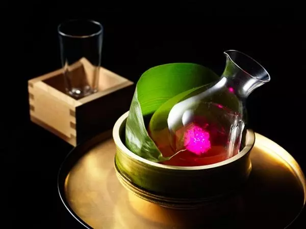 5・6月に登場する「一寸法師」は、日本酒にレモンジュース、レモンの皮、ミントの葉を加えたさっぱりとした味わい。朱色の器にドリンクを入れ、上から抹茶のアイスクリームを添えた。