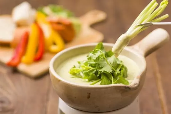注目はスイスなどのアルプス山岳部やその周辺地域の家庭料理であるチーズフォンデュにパクチーペースト等を加えた緑色のチーズソースの「パクチーズフォンデュ」。パクチーの茎とチーズソースの相性が抜群だ。
