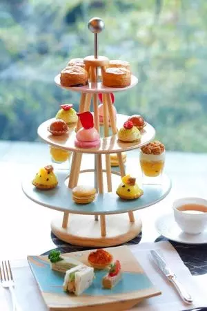 アフタヌーンティーのスタンドは、お寺の三重塔に見立てたデザインが特徴。京都産の檜を使用した、円錐形の立体の芯を中心に、大・中・小のサイズ別のフラットなプレートをはめることで、軽やかなデザインにリズムが生まれるよう演出。盛り付けたお菓子がすべて美しくみえるようデザインされている。