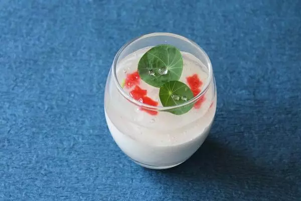 「Rain Dance」は「梅雨」を表現したヴェリーヌ。下からパイナップルのコンポート、レモンとライムのムースを重ねた。1番上のバジルジュレの中には、赤い金魚が泳いでいる。ピリッとした辛みのあるナスタチウムの葉には、雨の雫が輝き、まるでやさしい雨音が聞こえてきそう。