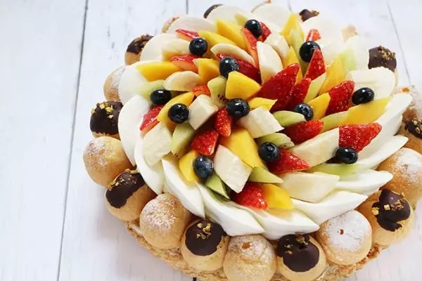 シュークリームを積み重ねた大胆なデザインの「プチシューフリュイ」は、より多くのフルーツをふんだんに使用してバージョンアップ。プチシューがクリームチーズのベースに飾りつけられている。
