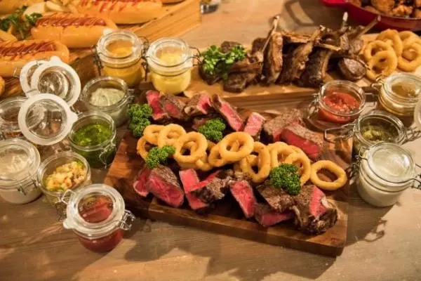 料理の目玉は、アメリカンサイズの豪快なグリル料理。10種類のソースをつけて味わう「牛サーロインのグリル」や「子羊のグリル」が登場する。また、ピリ辛の味付けでビールがすすむ「ローデッドナチョス」や、ワインに合うブルーチーズドレッシングのサラダなど、お酒に合う料理が多数並べられる。