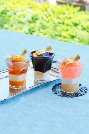 フレーバーは全3種類。それぞれゼリーやジュース、ムースなど、食感の異なるアイテムを一つにまとめている。桃尽くしの「ピーチ」は、桃のジュースの上に、泡ムース、ゼリーを重ね、天面には白桃のコンポートを。混ぜると、100%果汁のジュースがコンポートとゼリーのみずみずしさを引き立て、桃のフレッシュな香りを感じられる。