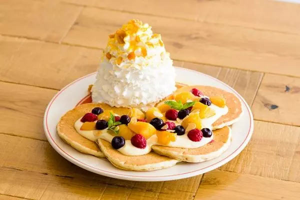 湘南江の島店で発売される「エリマ パンケーキ」は、マンゴーピューレを加えて濃厚なクリームチーズソースをかけた一皿。仕上げにマンゴー・ラズベリー・ブルーベリーといった夏らしいフルーツをトッピングした。