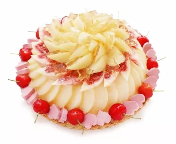 「織姫」をイメージしたケーキ「織姫~桃といちじくのケーキ~」はクリームチーズをベースに、甘みの強い山形県のさくらんぼ「佐藤錦」を贅沢に使用。みずみずしくジューシーな桃や、とろけるような甘さのいちじくと組み合わせ、ハート型のラズベリームースを飾ったスペシャル感満載のケーキとなっている。