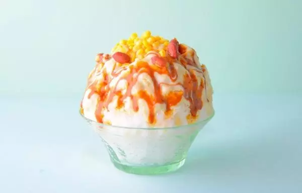 とうもろこしの粒をトッピングした「とうもろこしとココナッツミルクのスイーツかき氷」も登場。こちらは、とうもろこしとココナッツミルクで作ったソースをキャラメルソース風にアレンジして、氷の上へ。食感のアクセントに、とうもろこしとピーナッツを添えている。