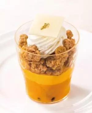 「ヴェリーヌ トロピカル」はマンゴー・パイナップル・ライチの果肉が入ったフルーツカクテルの上に、マンゴー&パッションフルーツのクリームを合わせて、甘酸っぱくさっぱりとした仕上げた一品。さらに、ザクザク食感のココナッツ入りシュトロイゼル(そぼろ状の焼き菓子)と、ココナッツ風味のシャンティをトッピングした。シュトロイゼルにソースやフルーツを絡めて味わって。