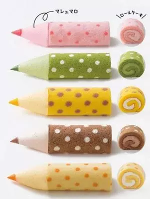 大阪新阪急ホテル地下1階ベーカリー&カフェ「ブルージン」の新作は、まるで色鉛筆のようなポップな仕上がり。クリームを包んだロールケーキにドット柄をあしらい、とんがり型のマシュマロを組み合わせた。