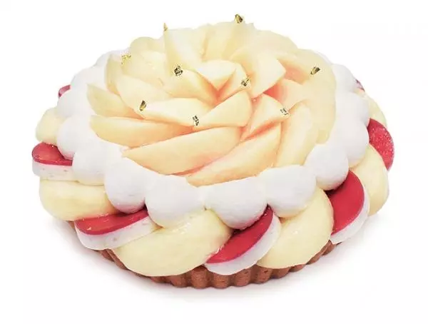 岡山県産「白桃」のケーキには、恵まれた気候風土で大切に育てられた白桃を使用。なめらかな肉質とたっぷりの果汁、そして糖度の高さが特徴の桃を大ぶりにカットし、花のように贅沢にあしらった。