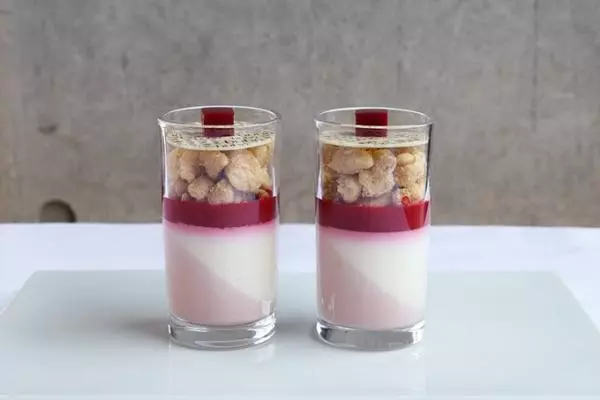 ムースやゼリーをグラスに重ねた、鮮やかな見た目のひんやりスイーツ「ヴェリーヌ」が4種類登場。「ハナ」は、甘酸っぱいイチゴのパンナコッタと、ミルキーなバニラのパンナコッタを2層に重ね、ザクザクの食感のマカダミアナッツクランブルや、ラズベリーゼリーをのせた。ピンクとホワイトの層がなすグラスは、キュートでスタイリッシュ。
