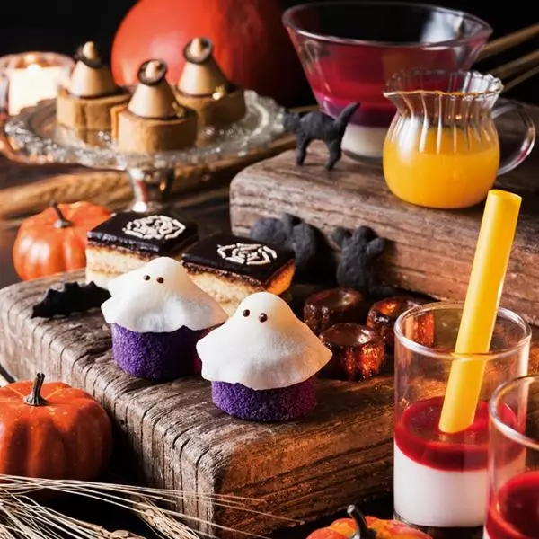 期間中は紫芋のロールケーキの上に、求肥で作ったオバケが現れた「ファントム・ロール」や、キャラメルムースとマロンロールで魔女の帽子を模った「ムースとロールケーキのエナン」などを展開。さらに、ドラキュラが血を飲む姿をイメージしたストローで味わう飲むグラススイーツや、別添えのオレンジジュースをかけて色の変化を楽しむ紫芋のデザートスープも。また、秋のフランス料理などフードも提供される。