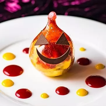 そして最後のドルチェでは、ハロウィンのアイコンであるジャック・オー・ランタンを飴細工で作った繊細なスイーツがお目見え。中にはとろりとしたパンプキンムースが入っている。