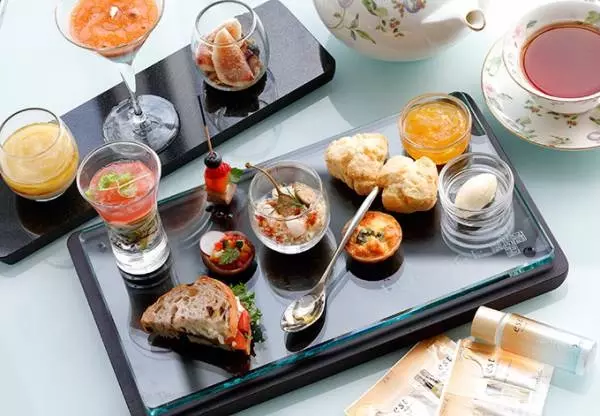 スイーツから食事メニューまで揃うアフタヌーンティーには、「est」からインスピレーションを得たユニークなものが盛りだくさん。「グラス“est”」は、オレンジからブルーのグラデーションになったパッケージから着想を得たデザート。ヨーグルトの爽やかな氷菓をベースに、ブルーキュラソーとバラが香るエスプーマで青色と橙色に色付け。はちみつやアンバーメイプルなど、低カロリーでビタミンやミネラルの含有量が高い素材を使用し、美容感度の高い女性にぴったりなスイーツに仕上げた。
