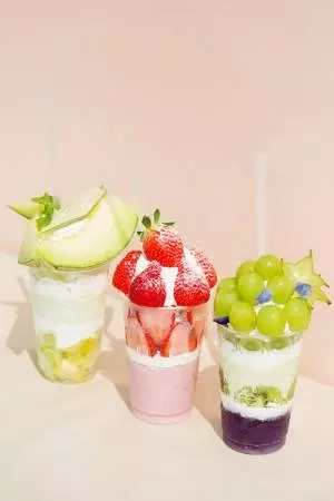 秋に向けて展開されるのは、皮ごと食べられる高級ぶどう「シャインマスカット」を約半房使った「シャインマスカットボンボン」。”青いお茶”バタフライピーで色付けしたライチジュレとキウイ&パインのソイスムージーに、ヘルシーな豆乳ホイップクリームを組み合わせた。トップには「シャインマスカット」を溢れんばかりにデコレーションして。乳製品不使用なのでたっぷり食べても罪悪感を感じないのも嬉しいポイントだ。