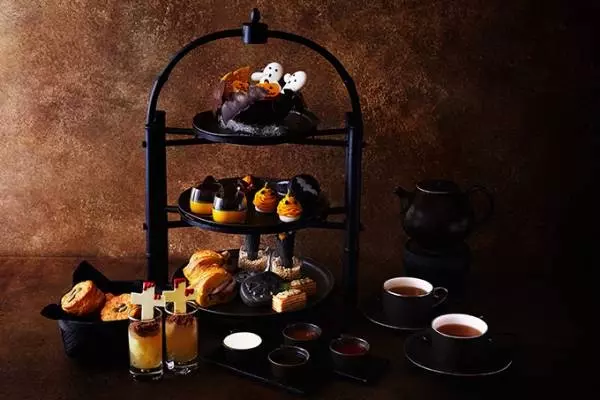 ハロウィーンらしいデザイン、オレンジや紫などのカラーリングで季節感と遊び心いっぱいのアフタヌーンティー。深みのある様々な種類の蜂蜜を使用したスイーツやセイボリー(塩味のもの)が並ぶ。