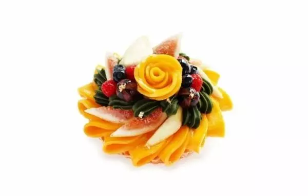 ベースは優しい甘みのカスタードクリーム。その上に、旬のフレッシュなイチジクや「祇園辻利」の宇治抹茶を使用したモンブランクリーム、ローズに見立てたマンゴーをトッピングしている。