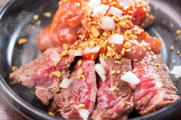 焼肉2+9からは、山形牛を世界三大珍味と合わせた「ブリスケの焼きしゃぶ温玉乗せ~世界3大珍味と共に~」が登場。ブリスケの焼きしゃぶをフォアグラ、キャビア、トリュフで飾った。さらに、淡路島の恵みトラットリアからは、トマトorガーリックソースでいただく「淡路牛のステーキ」が発売される。