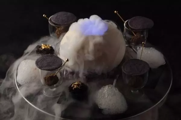 テーブルメニューは、ショーの世界観に合わせここでしか食べられない個性的なものを用意。ショーでその時演じられているシーンに合わせ、物語の中に登場する食事や舞台を再現した。フォアグラのムースやキャビア、トリュフで、霧が立ち込めるアテネの神秘的な森を表現したプレートが登場。鳥かごの中にぶら下がるロブスターの甲羅や燃え上がる炎に照らされたシーフードがドラマチックな1品も展開する。