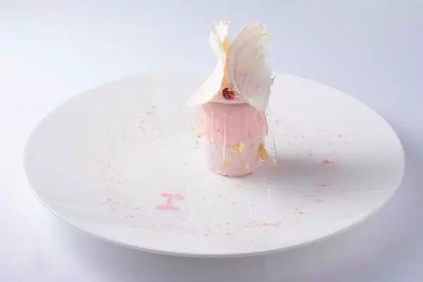 レペットのルーツである「バレエ」の世界観を表現した今回のデザート。アイコニックカラーであるペールピンクで統一し、金箔を纏った透明感のあるシートジュレでチュチュスカートを、ホワイトチョコレートで白鳥の軽やかな羽をデザインした。