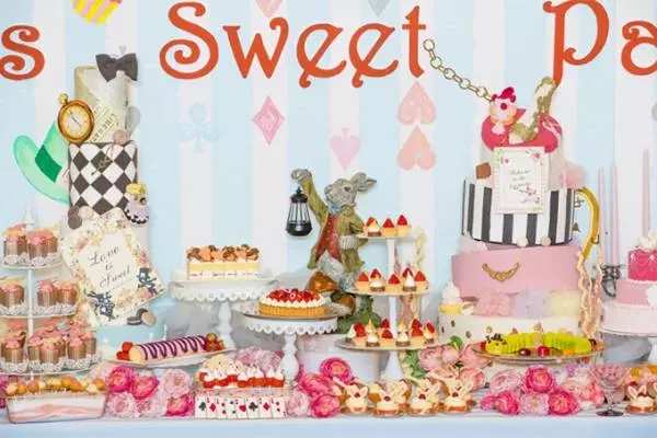 入り口には、トランプで飾られた緑のアーチとこちらに手招きするようなウサギの姿が。アーチをくぐり抜けると、そこにはお菓子でできた”不思議の国”が広がっている。