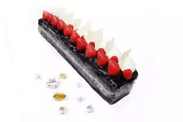 今回登場するのは、そんなキャラクター達が身にまとっている黒い服などをイメージしたケーキ「ショコラ ディアマンテ -フルーツのガトーショコラ-」。ガトーショコラの中にはいちじくやアプリコット、ベリーなどのミックスフルーツが混ぜ込まれており、表面にはユニフォームのベルトを銀泊スプレーでデザインした。上には、シャープにカットされたチョコレートをデコレーションし、宝石の繊細さやはかなさを表現した。