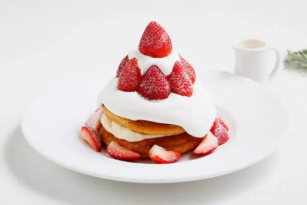 「スノーミルキークリームパンケーキ」はふわふわ&もちもちのパンケーキの間にバニラカスタードを忍ばせ、まるで「雪」を表現した滑らかな口溶けのミルキークリームをたっぷりとトッピングした一品。ミルクとクリームの濃厚なコクながらも、あったさりとした軽い口当たりが特徴だ。仕上げにみずみずしい苺をたっぷりとあしらった。